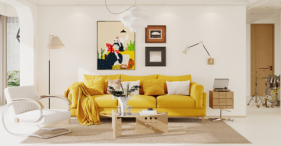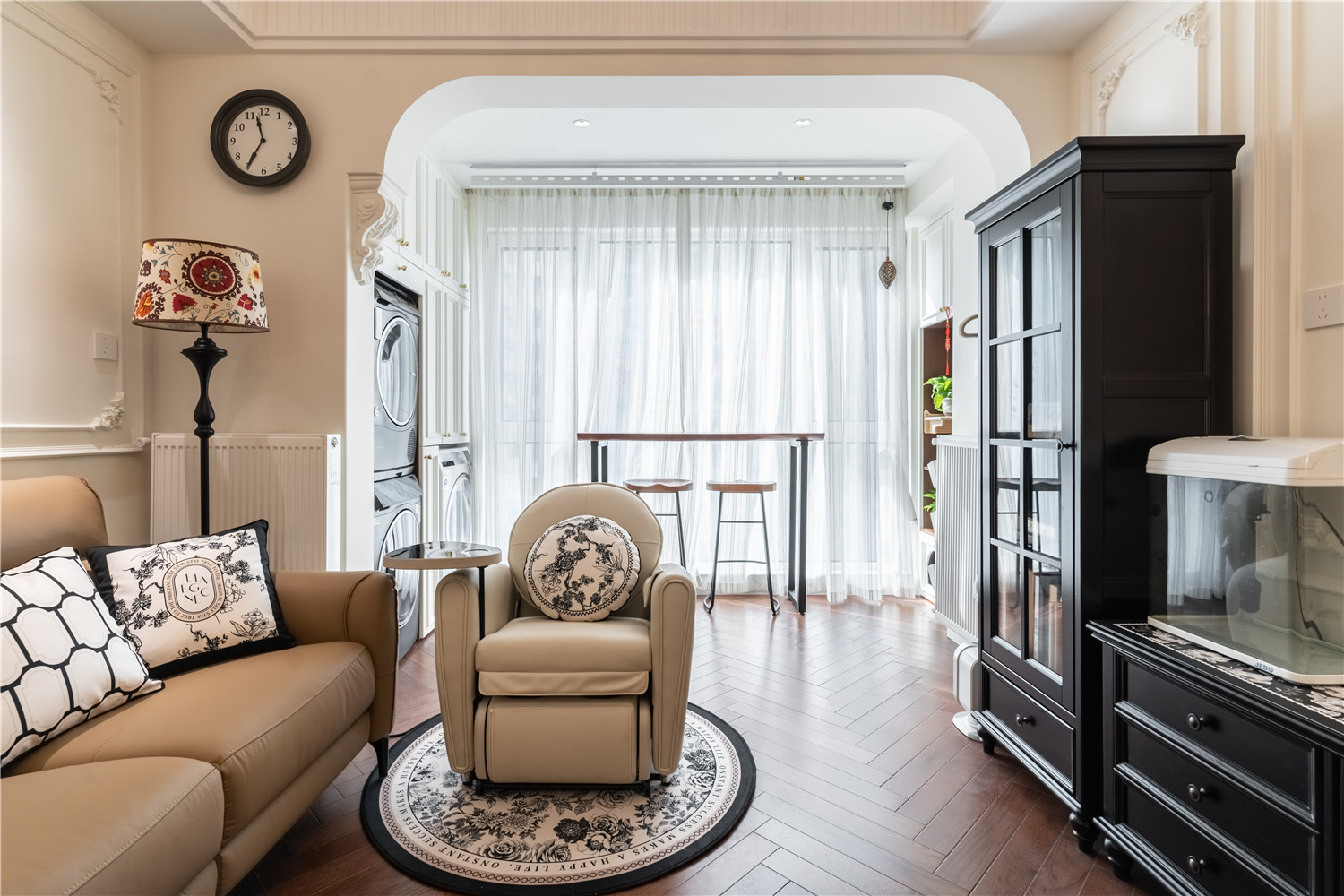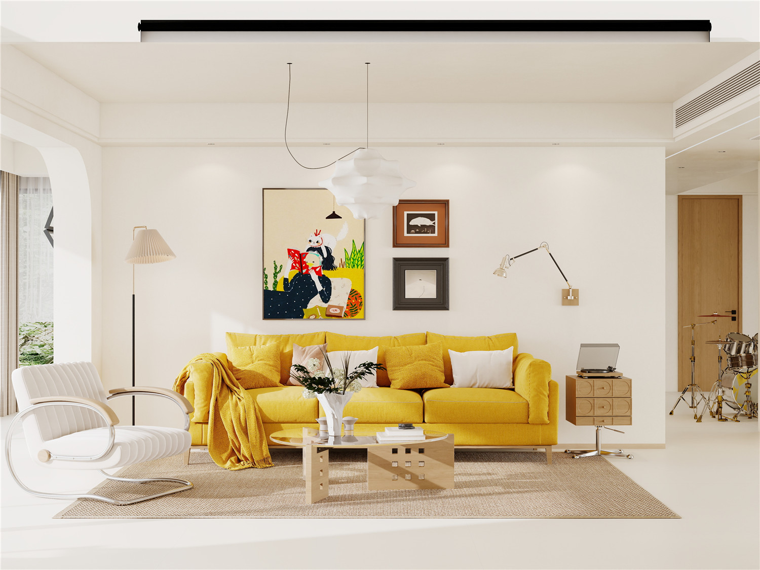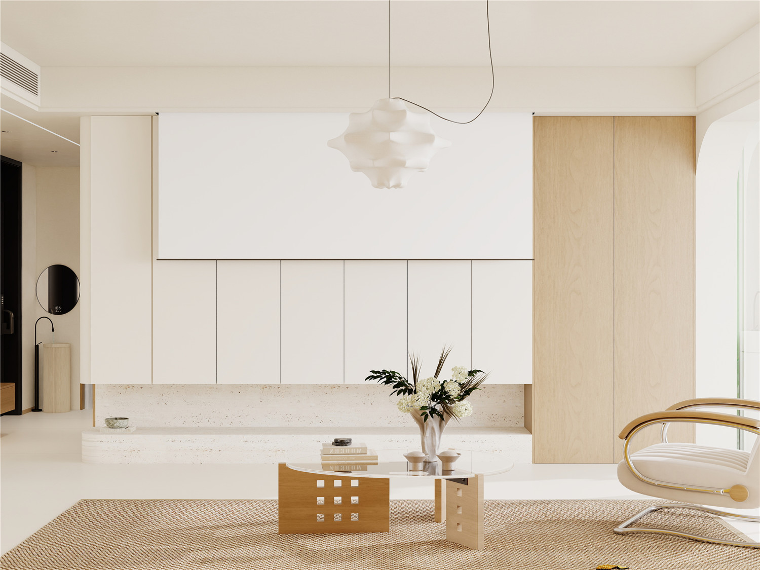 客廳區域借助莫蘭迪色系進行裝飾,強調一種朦朧的優雅氛圍。