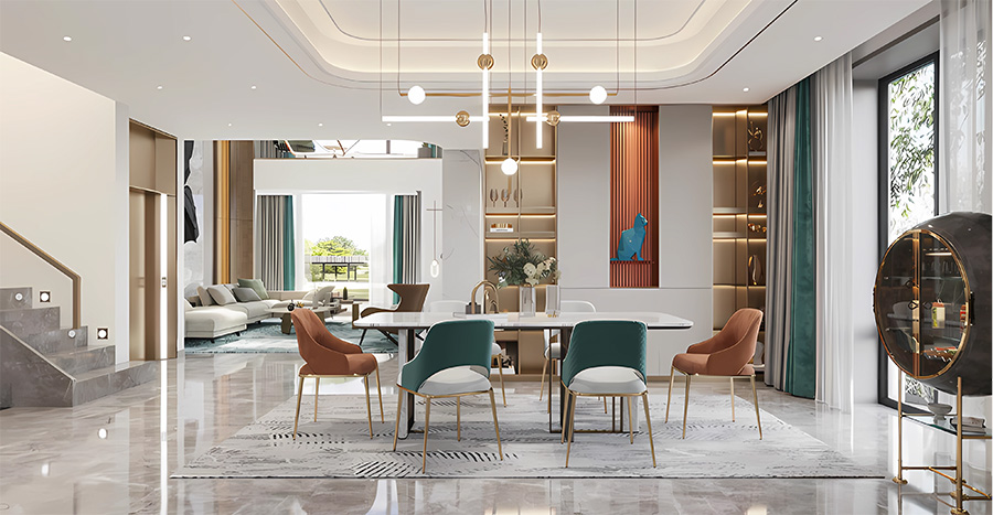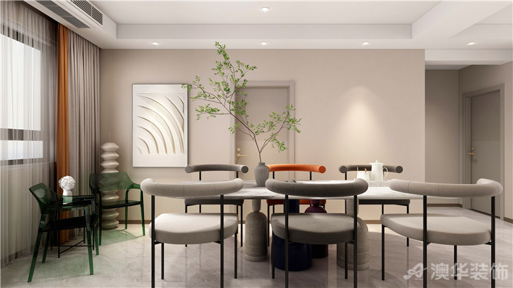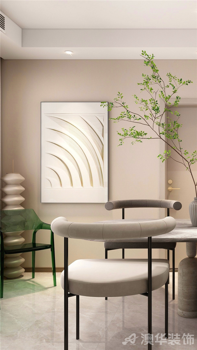 方正的餐廳搭配了奶茶色現代的桌椅,墻上的掛畫看起來簡單卻具有獨特的藝術氣息。