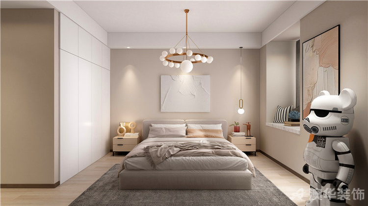 臥室仍舊保持了奶茶色的色調,每一處空間合理利用的同時,墻上掛畫都是獨特的現代簡約風格。