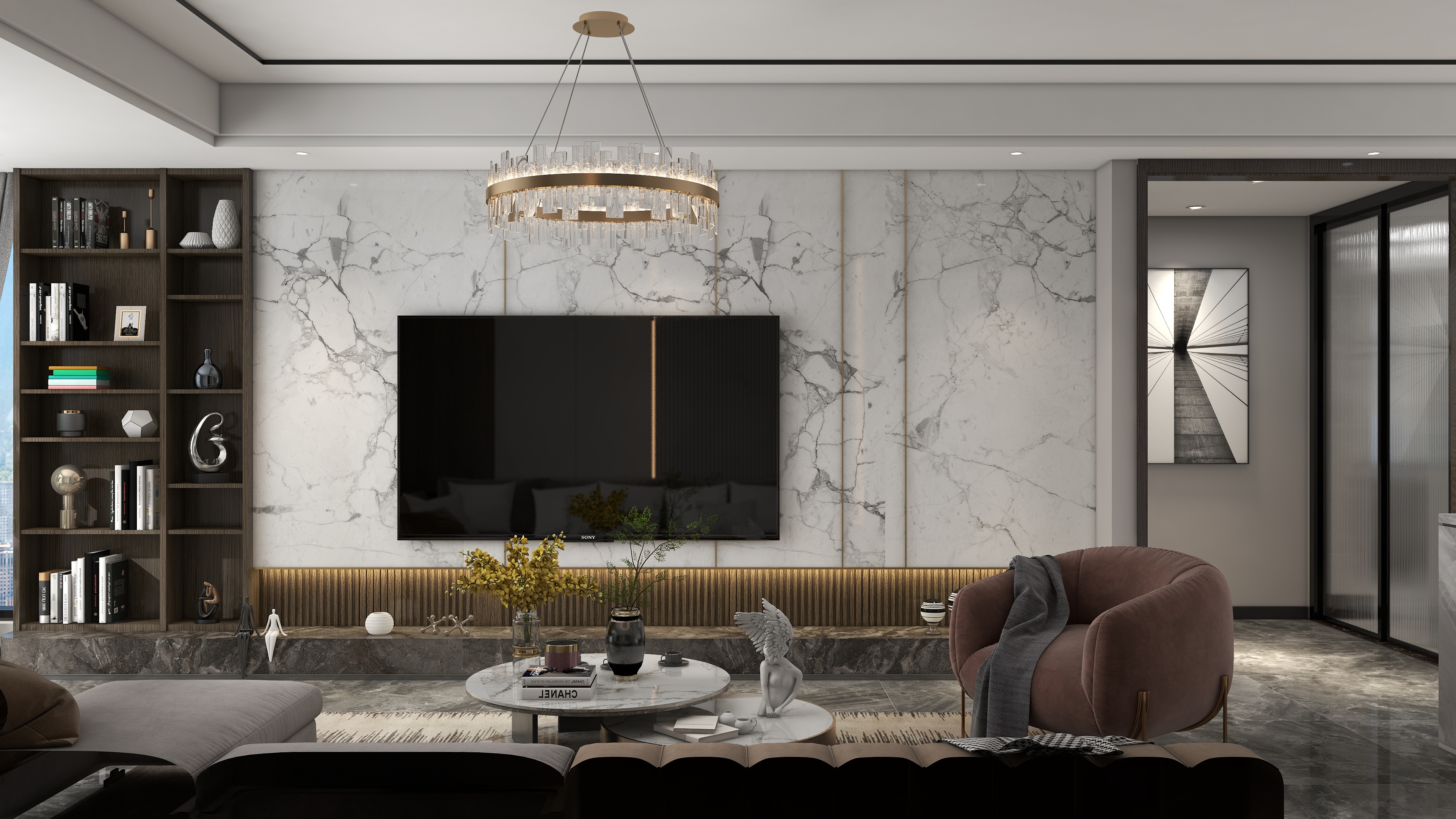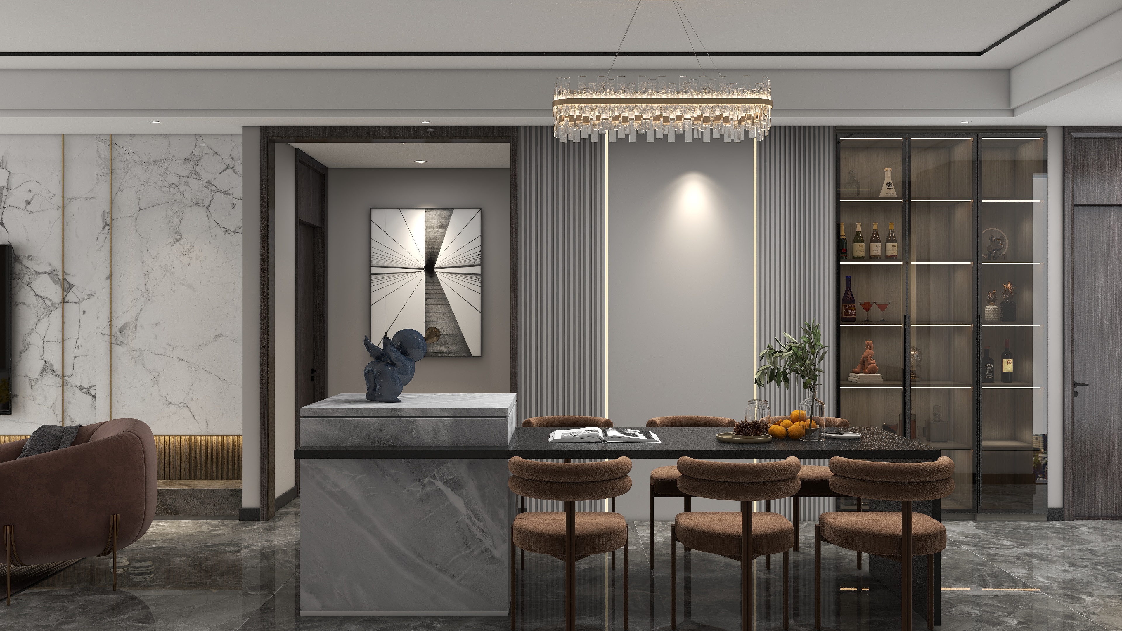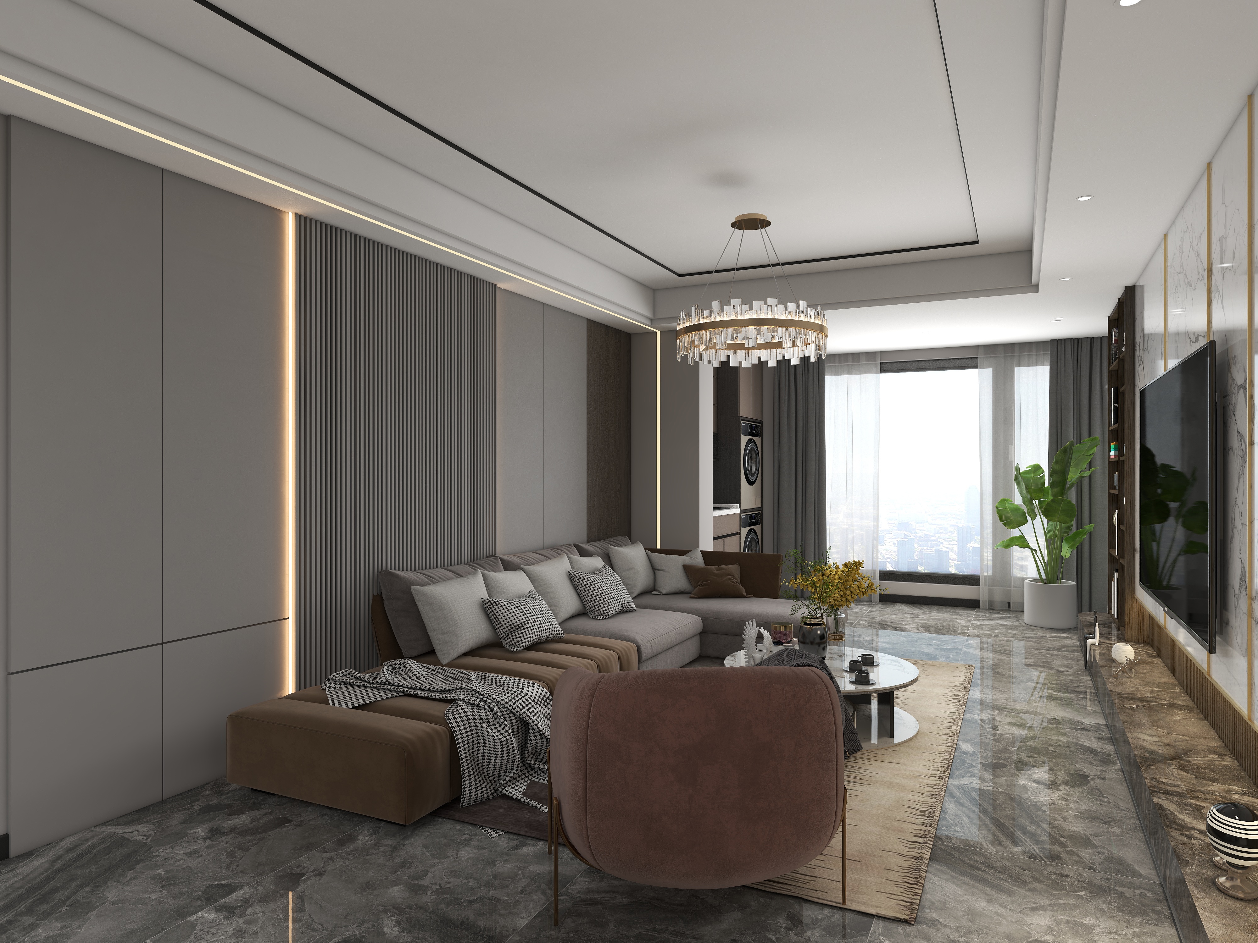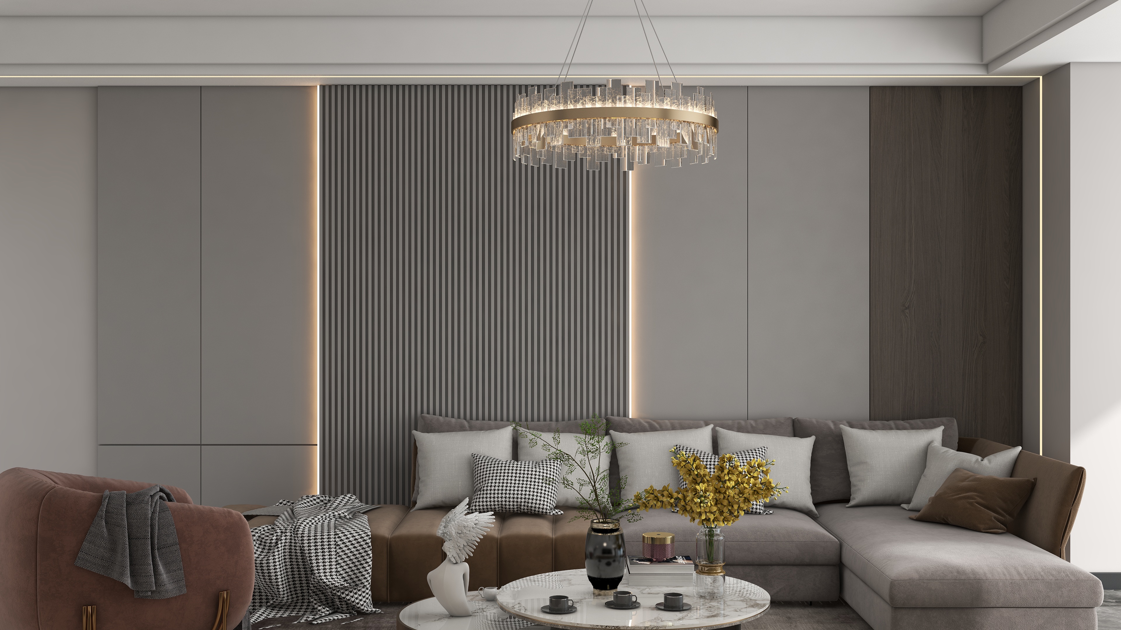 本案設計以線色調為主,線性燈點綴面,胡桃木的穩重色調進行搭配。沙發、燈具及軟裝的陳設,充分展現通透空間的所派感。以縱向穿插呈現空間的力度之美,展示美學點、線、面的特點之美,模糊空間界線、材質界線,造就層次流轉的界面語匯,盡顯空間魅力。