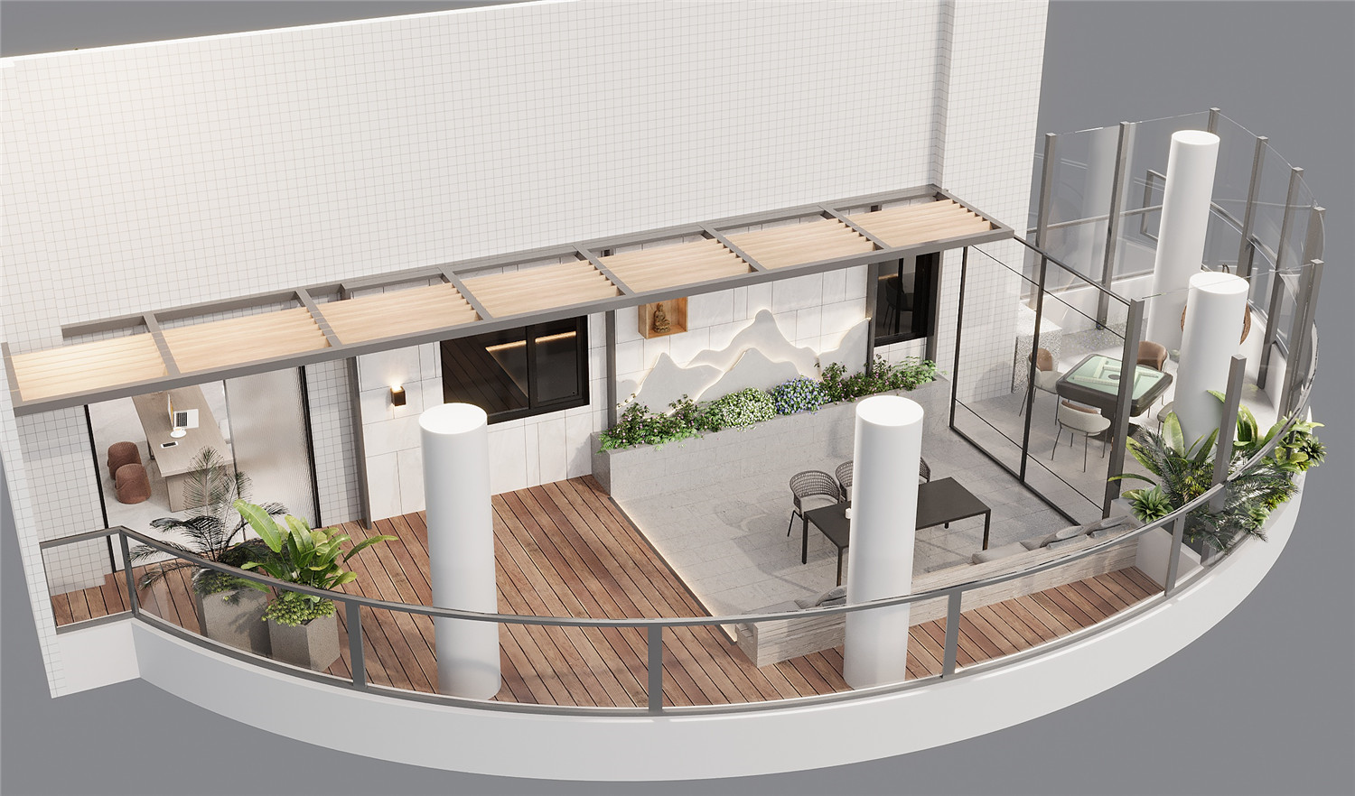 “家”是生活的容器,飽納居住者喜好與精神,項目位于漢陽一所平層,100㎡空中露臺區(qū)域是屋主最喜歡的地方,賦予弧形大陽臺更多功能,一部分用來種花草的生活陽臺,一部分是業(yè)主的娛樂室。改善室內采光,增加公區(qū)面積。對于后疫情時代的生活方式,屋主更注重生活的品質和幸福感,即使身處繁華的城市中也能有感受身處山林間的悠閑愜意。