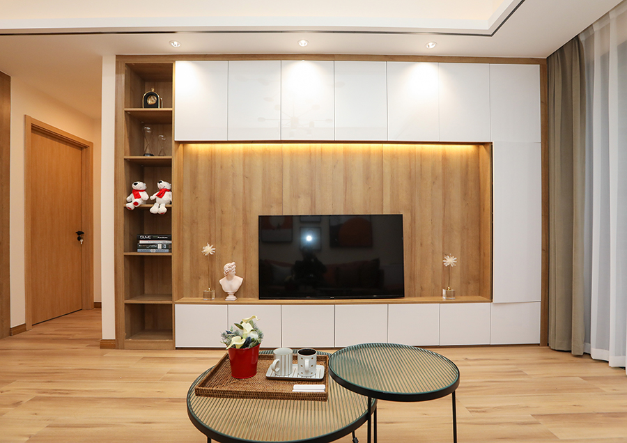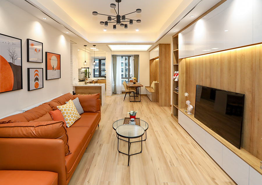 為了節省空間占用,客廳區域的電視背景墻巧妙的使用了一個原木混白色的儲物柜作為裝飾,簡約而又不失實用性。