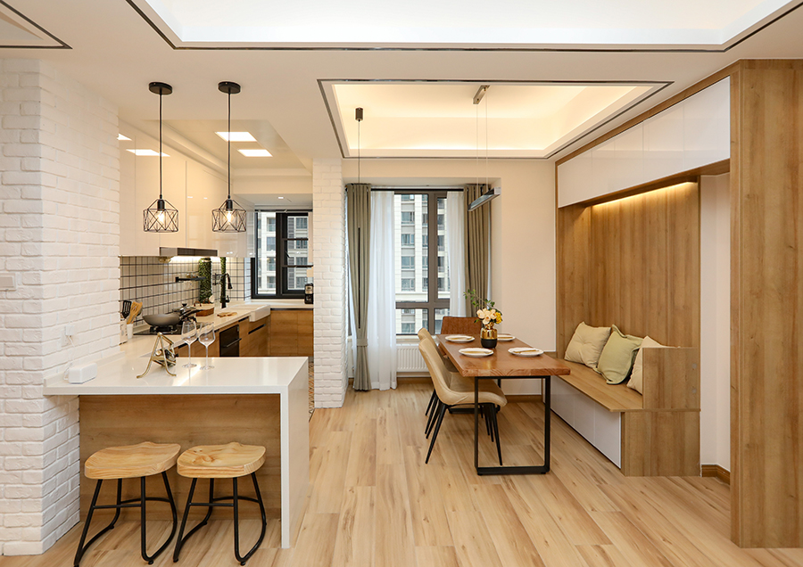 餐廳區域與半開放的廚房被攝制組愛同一個區域中,如此即可有效節約使用面積,又能夠確保上菜與就餐的時間得到縮減。