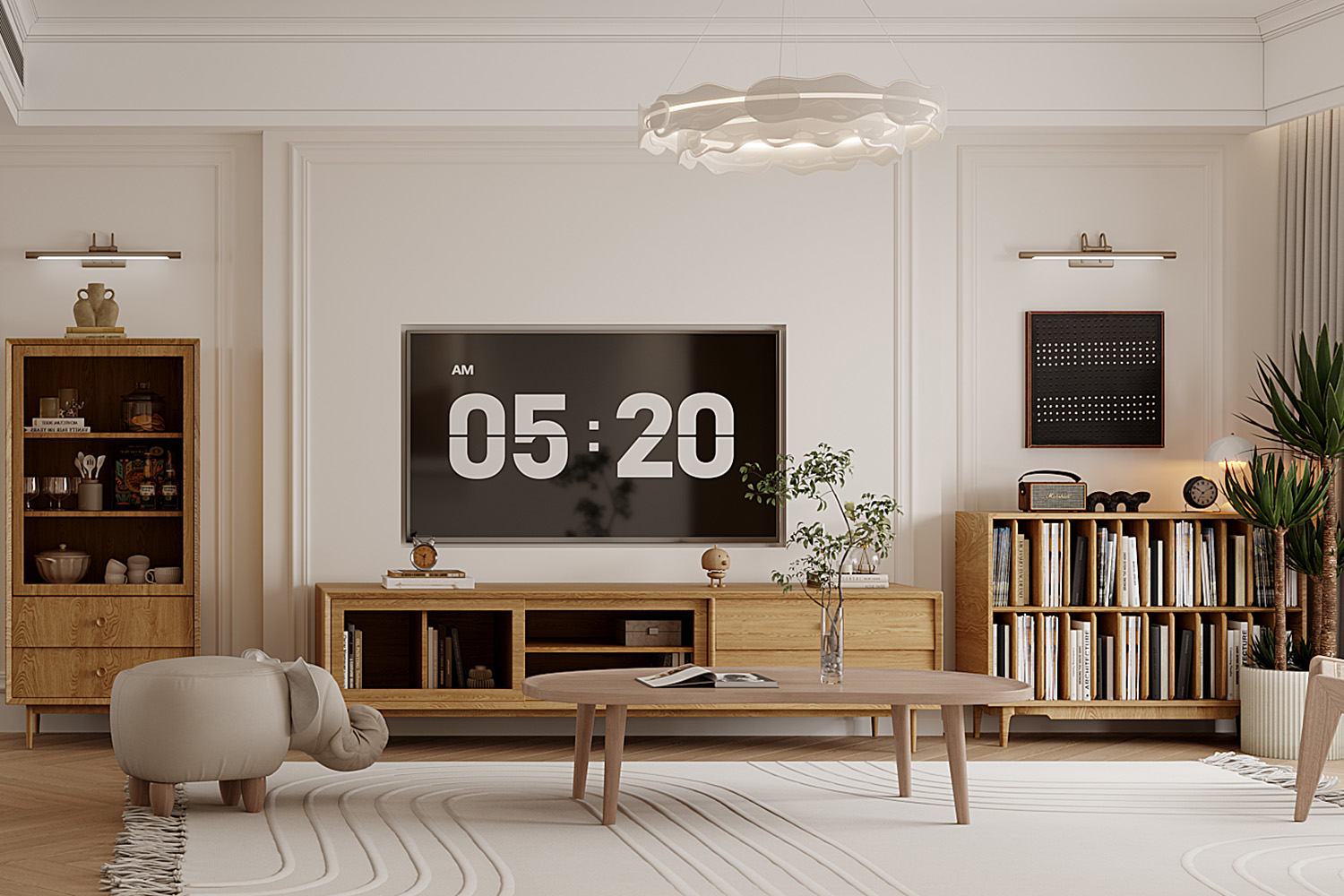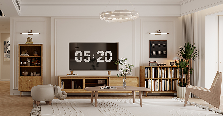 嵌入式的電視背景墻點(diǎn)綴上風(fēng)格青花瓷花瓶,讓空間中流淌著優(yōu)雅古韻。