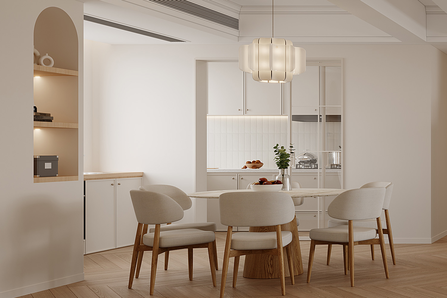 淡藍(lán)色的墻面為就餐區(qū)域增添了一抹清新明麗的氛圍,而造型優(yōu)雅的餐座椅則讓整個(gè)就餐區(qū)域多了一抹精致的浪漫感。