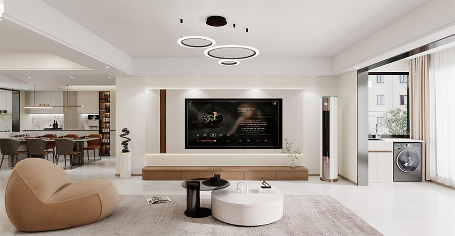 客廳的監控能實時看到老人獨居在家的生活狀態,過道小夜燈的設計能為家人晚上起夜提供溫馨的光,通鋪的防滑地磚,讓空間看著通透舒適。